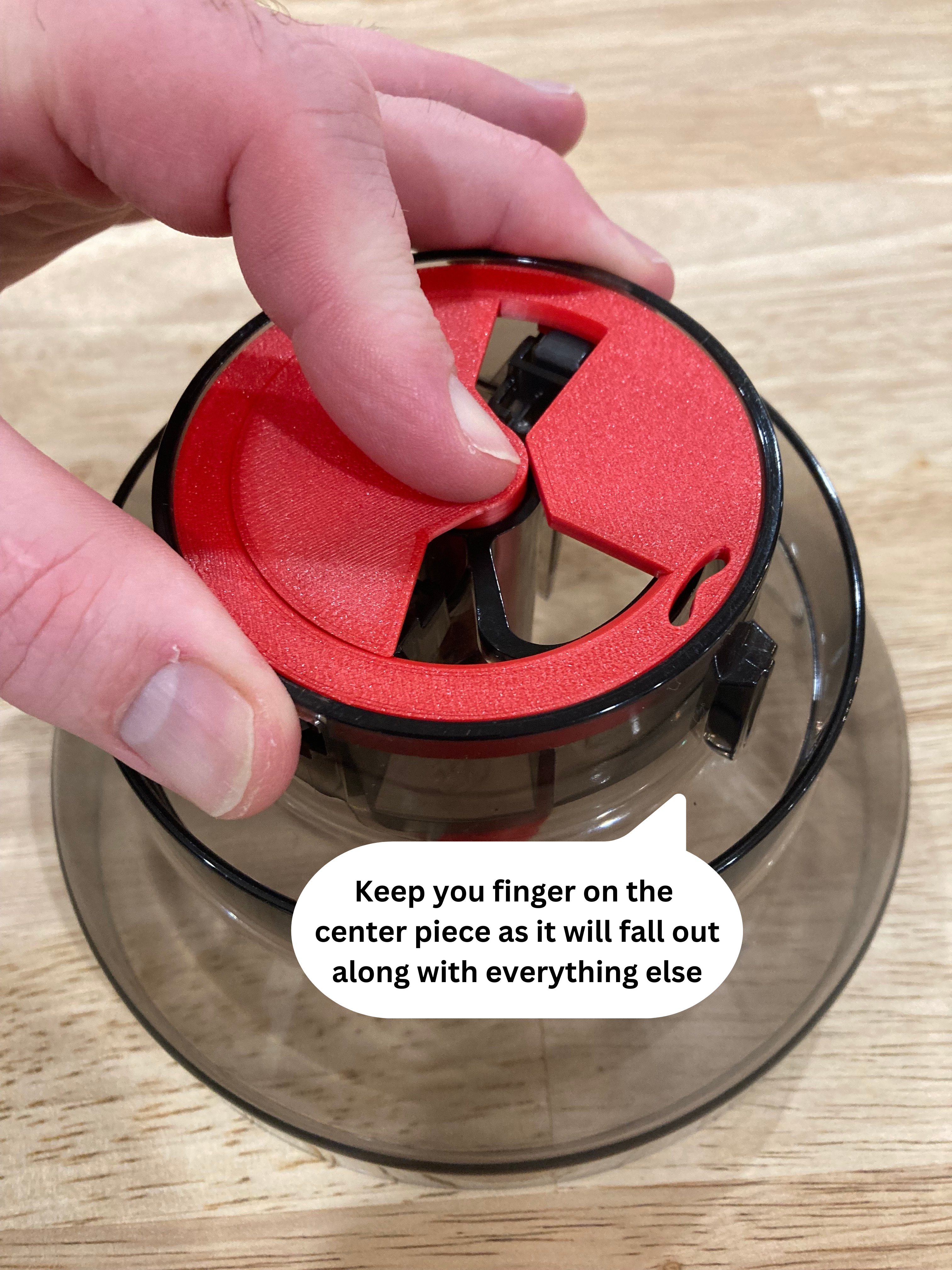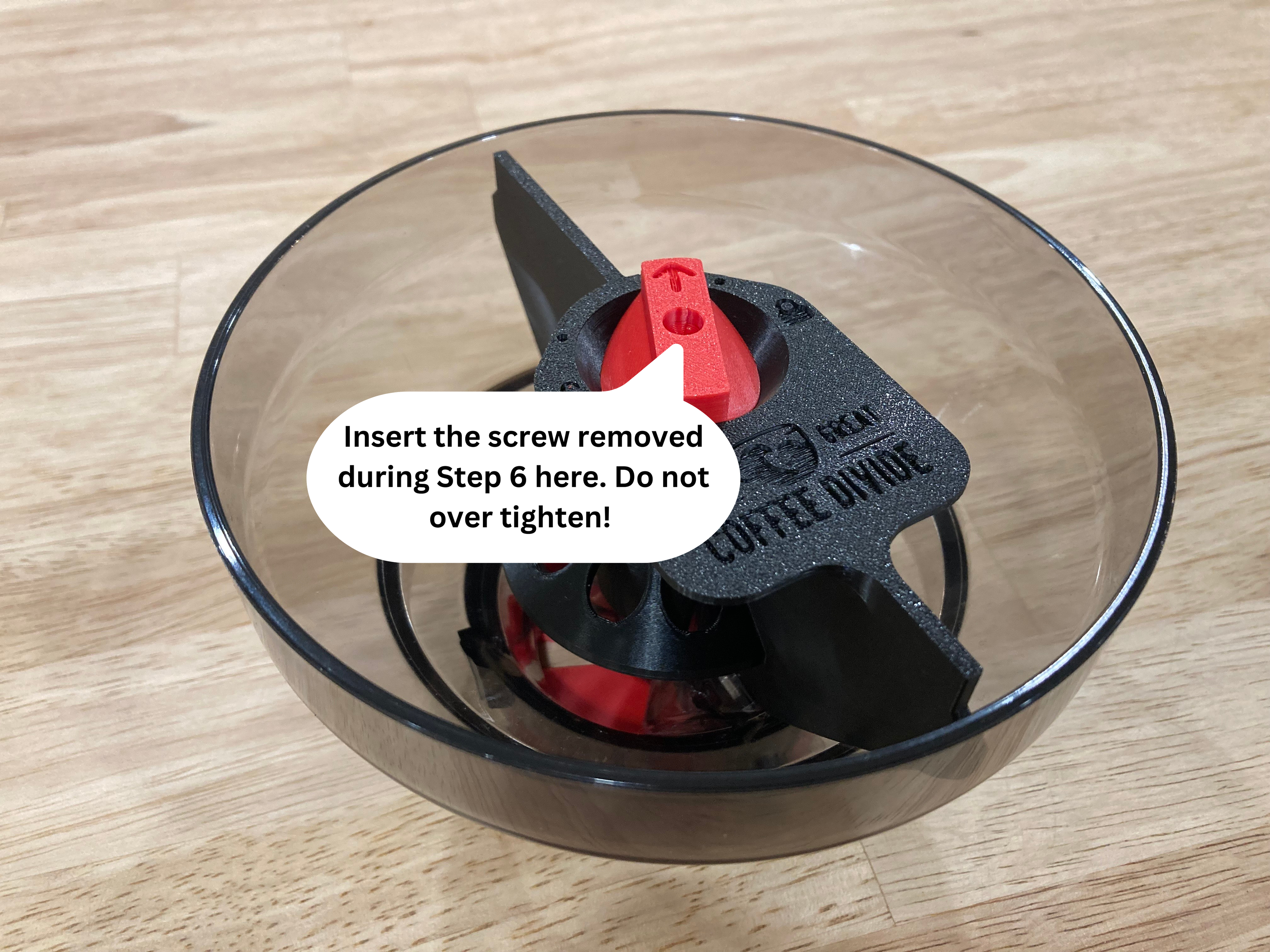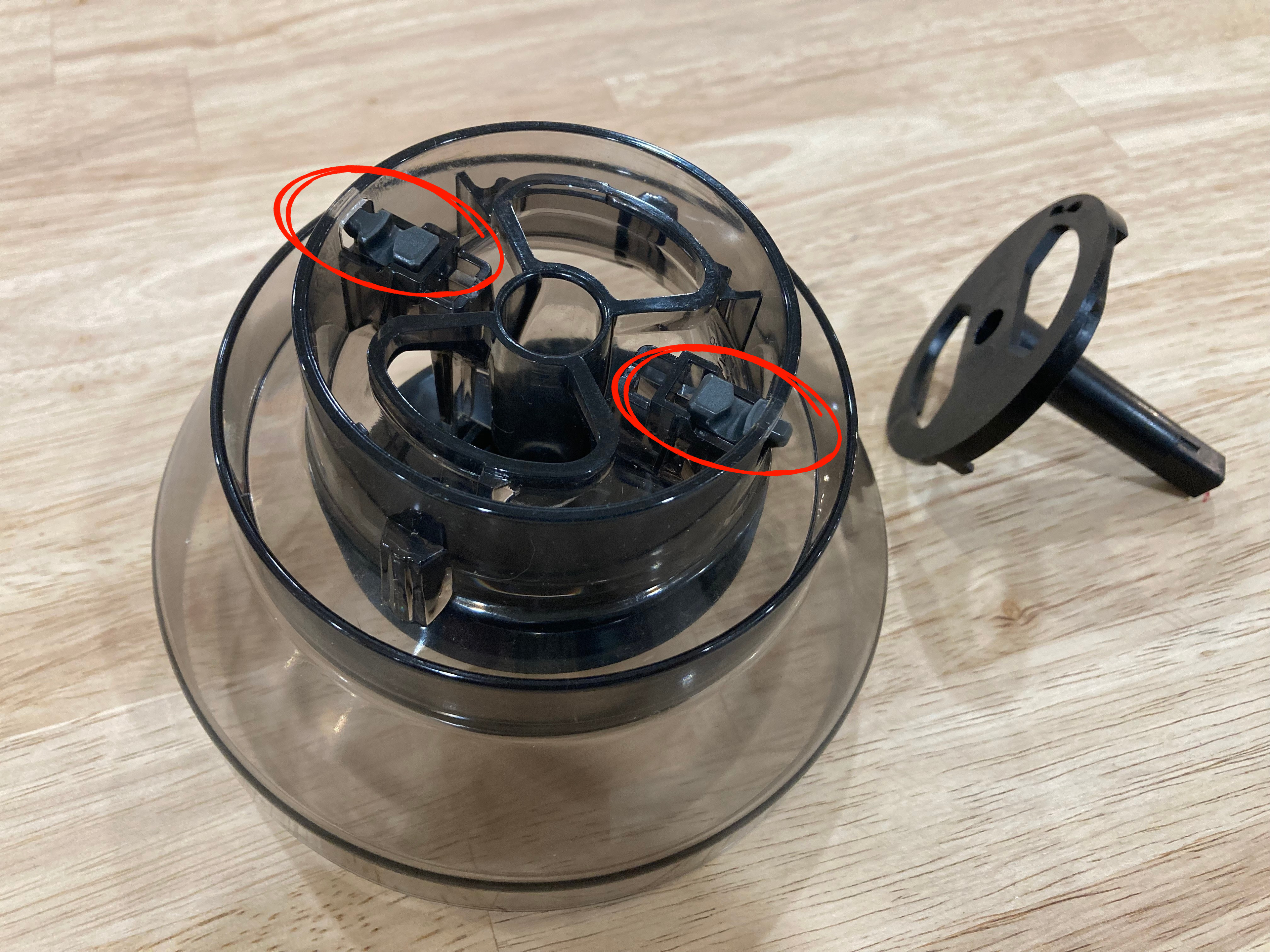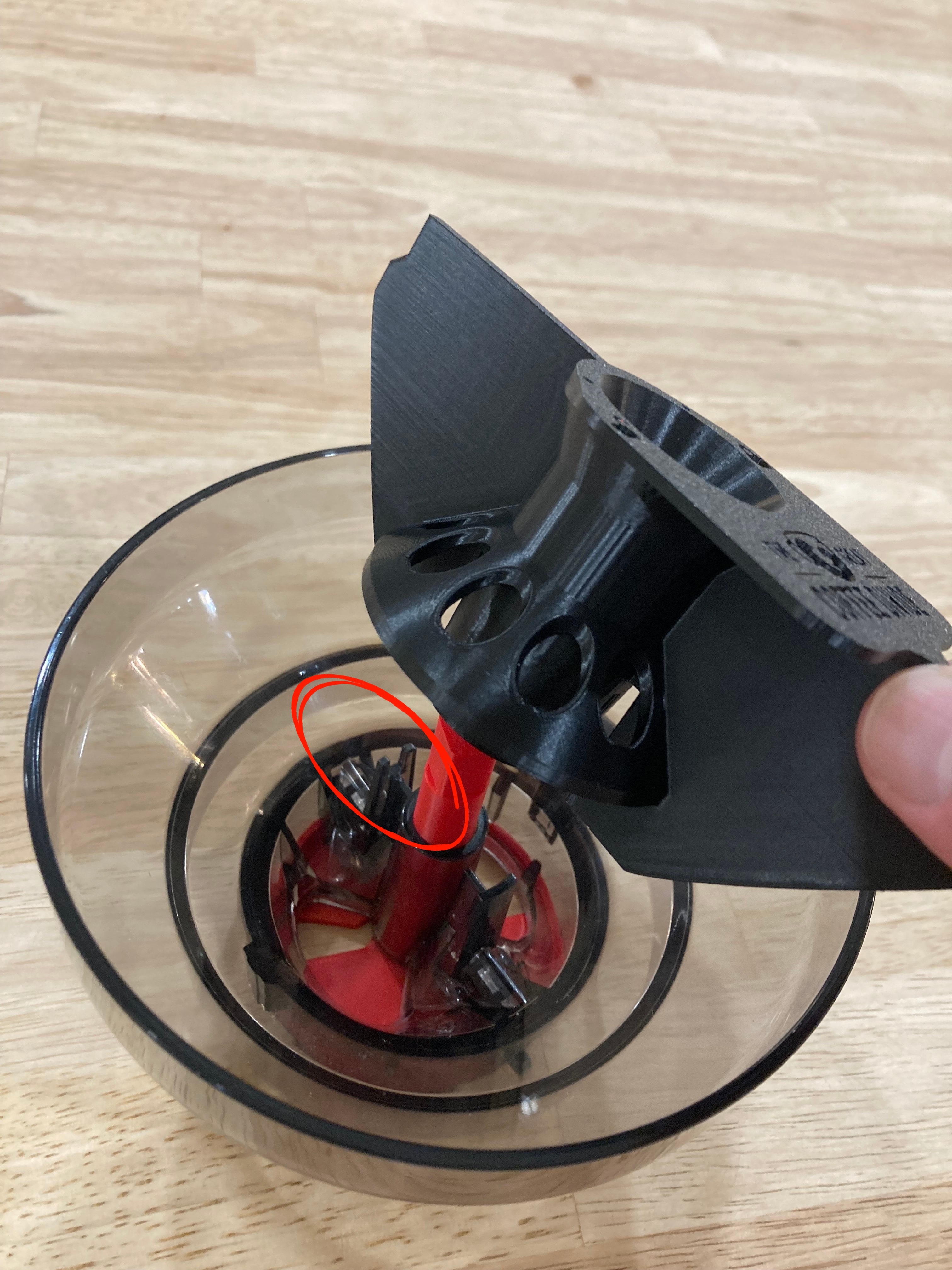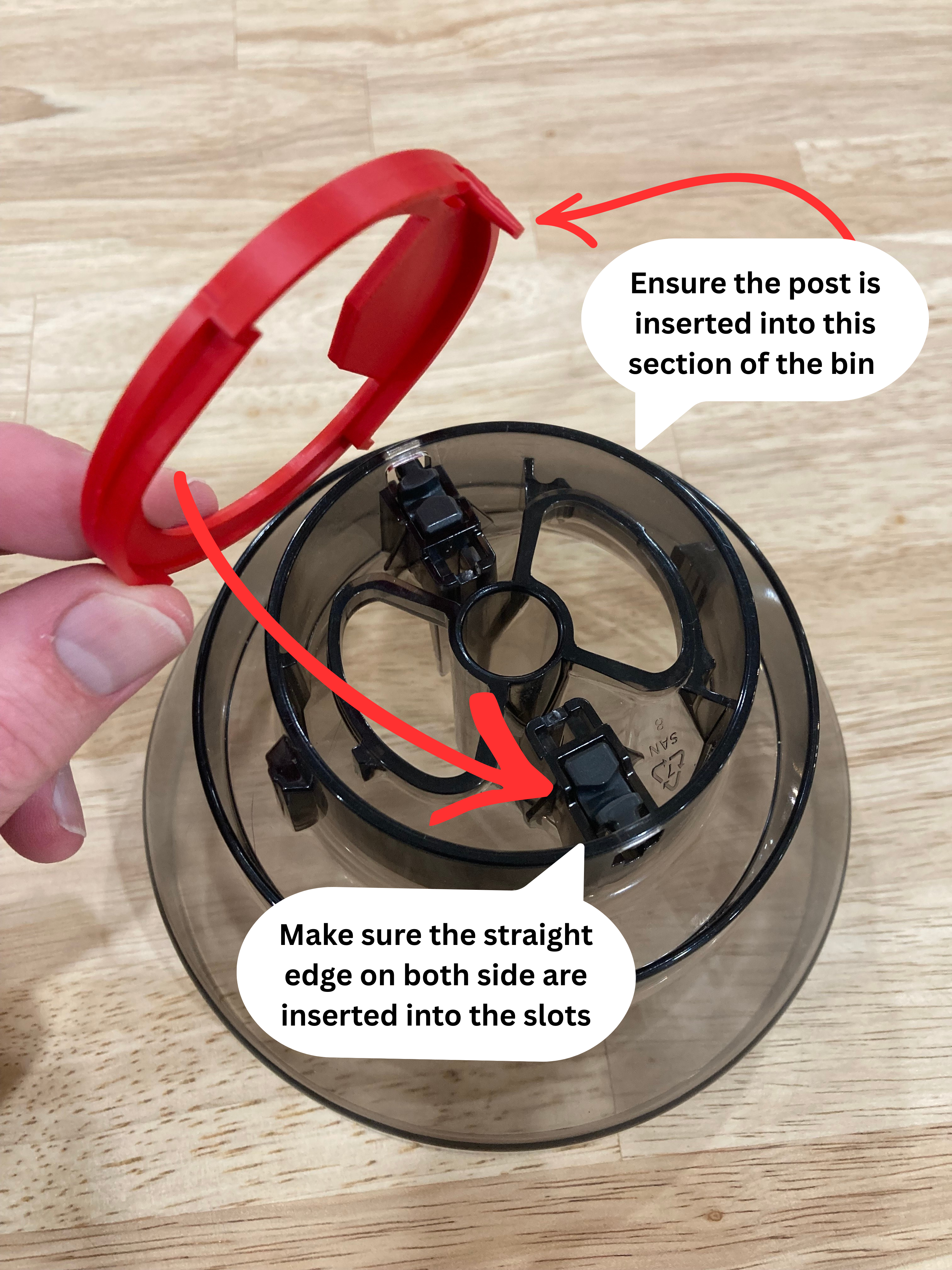 * Make absolutely sure the post slides in between the small section on the right-hand side of the bin as pictured. Get this wrong, and your bin won't turn or lock properly when you reunite it with the espresso machine. No pressure!